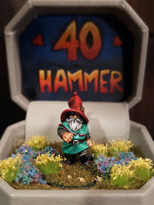 He is removable from his jewelry box so he can roam around the meadow. She often refers to ALL miniatures as 40 hammers, to coin a phrase, which is where the name comes from. It's a play on Warhammer 40,000 that rolls off the tongue a little easier and implies we are talking about models of 40k.